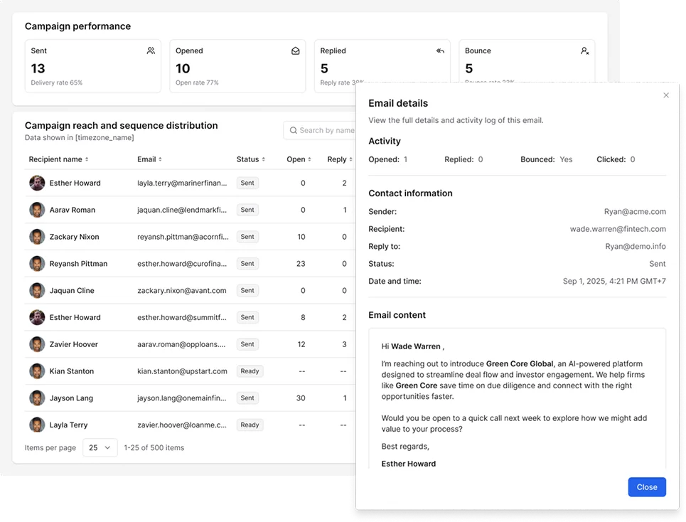 See who opened, read, and replied. Follow up with interested prospects directly—replies come to your designated inbox.